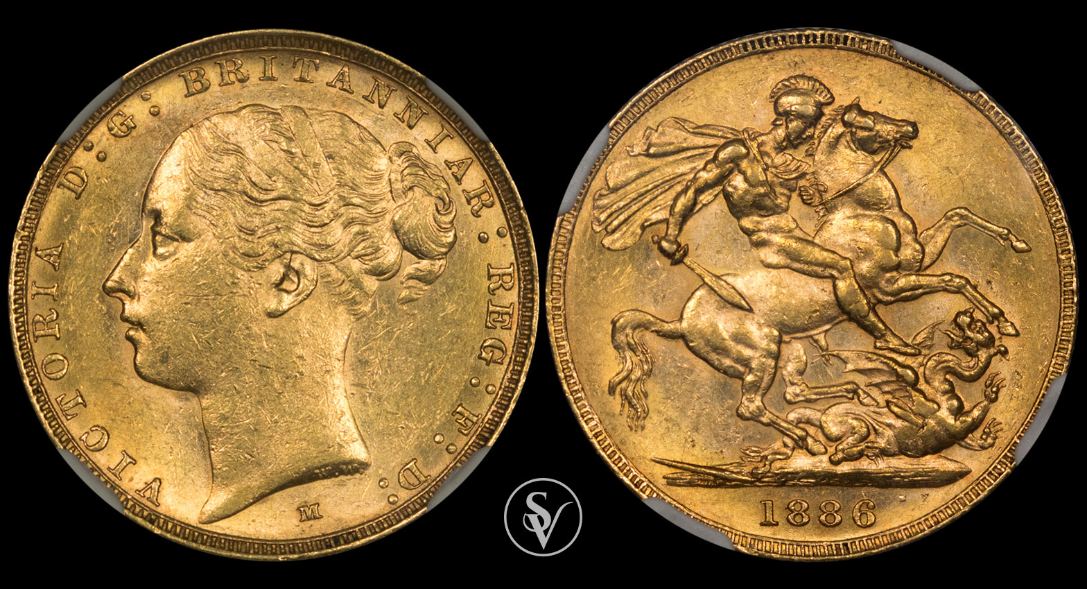 1886 Χρυσή λίρα Βικτώριας με τον Άγιο Γεώργιο που σκοτώνει τον δράκο πιστοποιημένη σε AU58 NGC