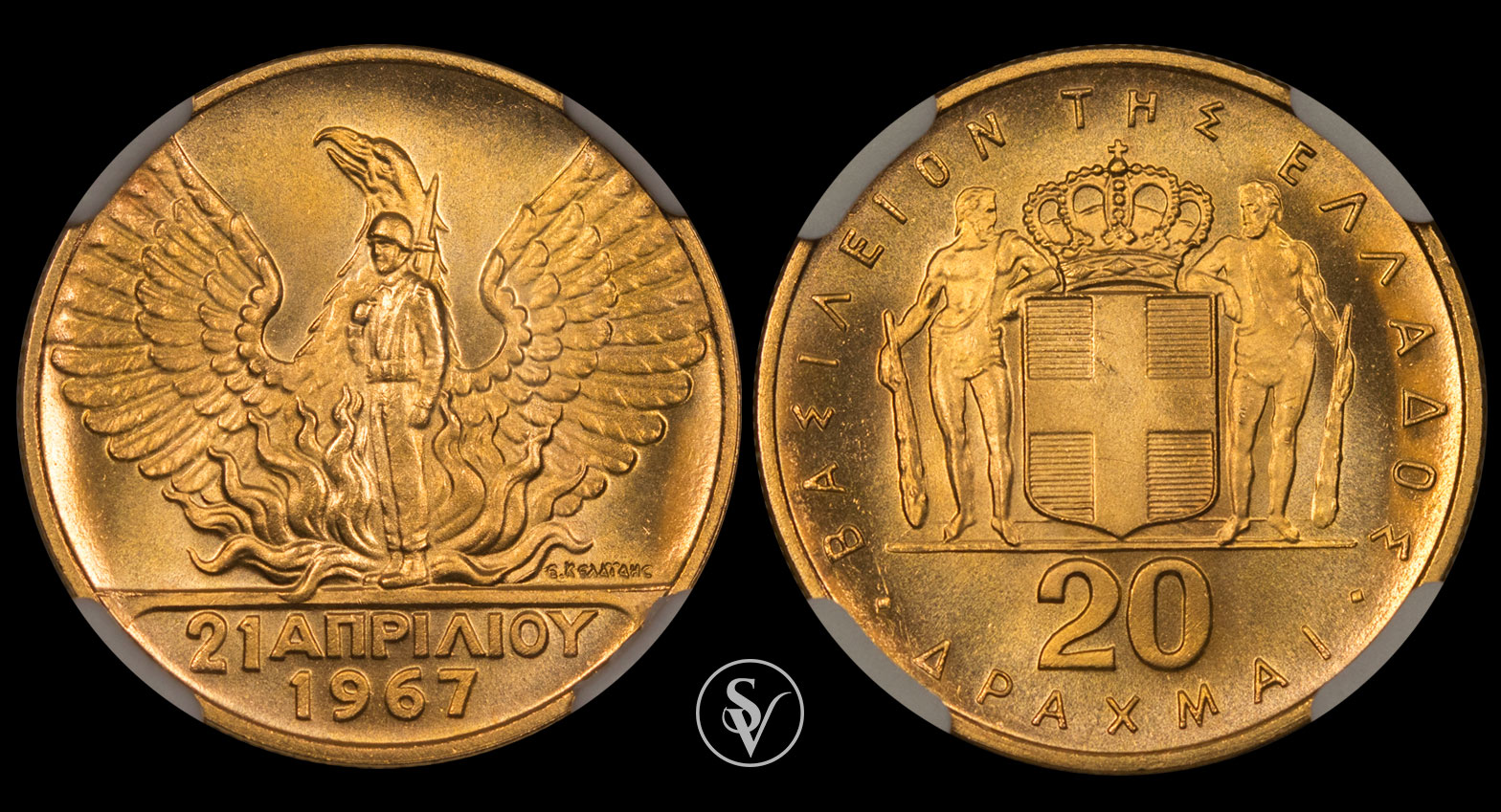 1967 χρυσό 20 δραχμές πιστοποιημένο σε MS66 NGC