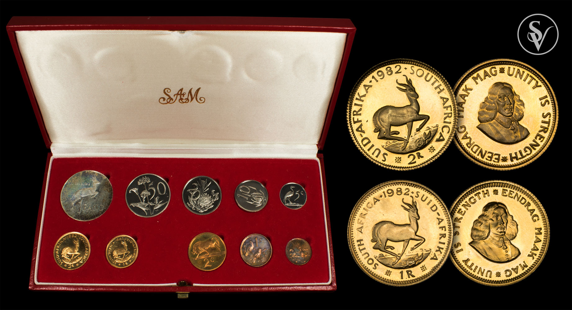 1982 Νότιος Αφρική σετ 10 νομισμάτων με δύο χρυσά νομίσματα 1 rand and 2 Rand και ένα ασημένιο 1 rand