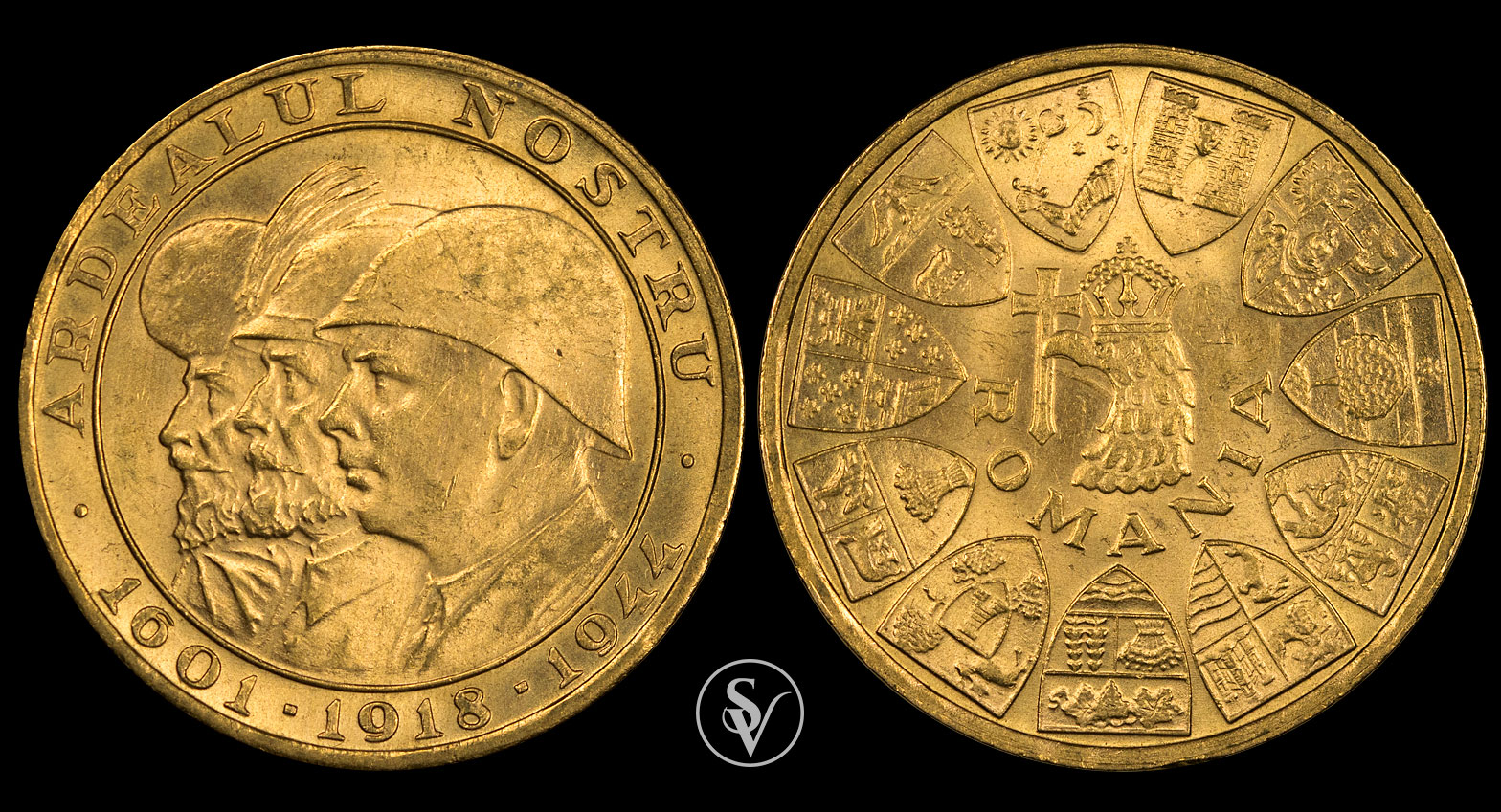 Obverse: Overlapped figures of Michael the Brave, King Ferdinand and King Michael in a circle, outside inscription "ARDEALUL NOSTRU" and years "1601", "1918" and "1944" separated by a dot.